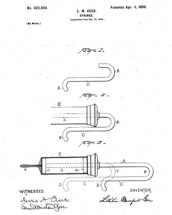 8. “Que se sepa que Letitia Mumford Geer, ciudadana de los Estados Unidos […], ha inventado una nueva y útil mejora en las jeringas”. Patente nº 662.848, 11 de abril de 1899.